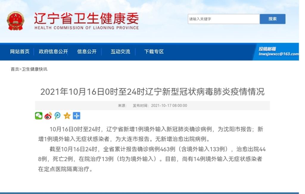 • 10月16日遼寧新增1例新冠肺炎確診病例為境外輸入病例
