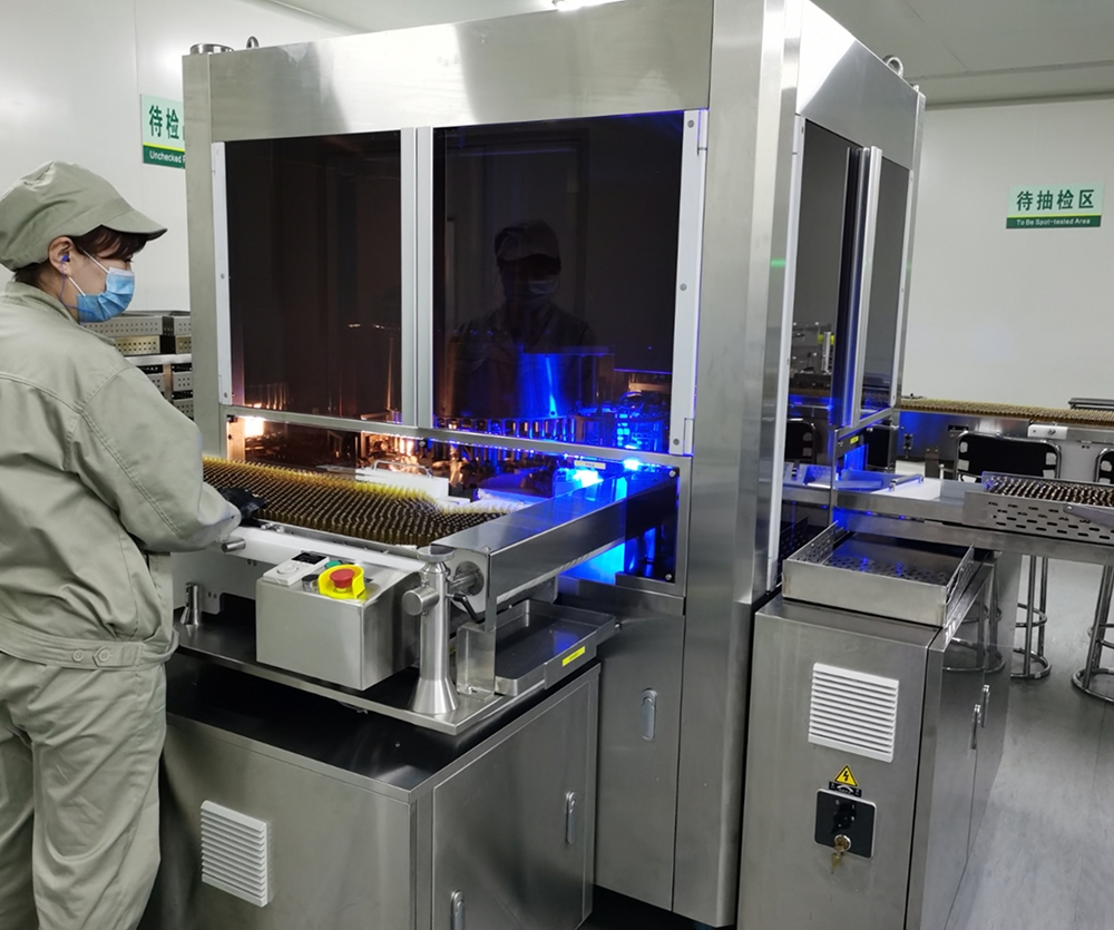 據102分廠主管質量技術的副廠長孫長海介紹,在灌裝藥液前,每支安瓿瓶須經過超聲波清洗和三次注射用水及壓縮空氣組合清洗方式進行內外壁清洗,再通過隧道烘箱高溫滅菌。在燈檢檢漏環節,東北制藥引入先進的燈檢檢漏一體機,通過4臺相機連續拍照,對每支藥品可見異物進行比對剔除,并通過高壓放電,檢測瓶體是否存有隱裂。
