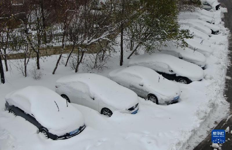 11月9日,在沈陽市和平區沈水灣公園,積雪將停放的車輛蓋住。無人機照片 新華社記者 楊青攝