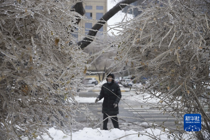 2021年11月8日,哈爾濱迎來雨雪冰凍天氣,一名市民在觀看結冰的樹木。 新華社記者 張濤 攝