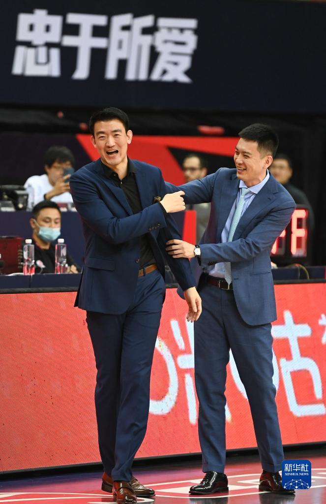 11月14日,遼寧本鋼隊主教練楊鳴(右)與浙江廣廈控股隊主教練王博在比賽后。新華社記者 孫凡越 攝