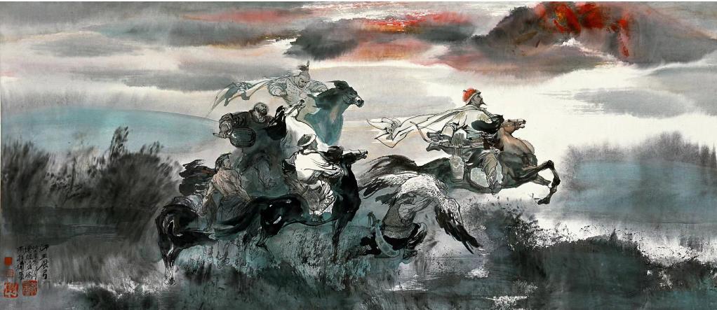 郭德福說:“第一期內容是我和宋雨桂創作的《艷粉姑娘》?!碑嬛?,一位妙齡少女在渾河岸邊浣洗衣服,她的身旁是一片蘆葦塘。在創作時,宋雨桂用了歐洲印象派半抽象的畫法,用水墨氤氳出了蘆葦塘的模樣。郭德福說:“在創作《薩爾滸大戰》時,宋雨桂也用了這種蒼茫的筆觸勾勒遠山和樹木,瞬間就把戰場的氣氛烘托出來?!?/p>