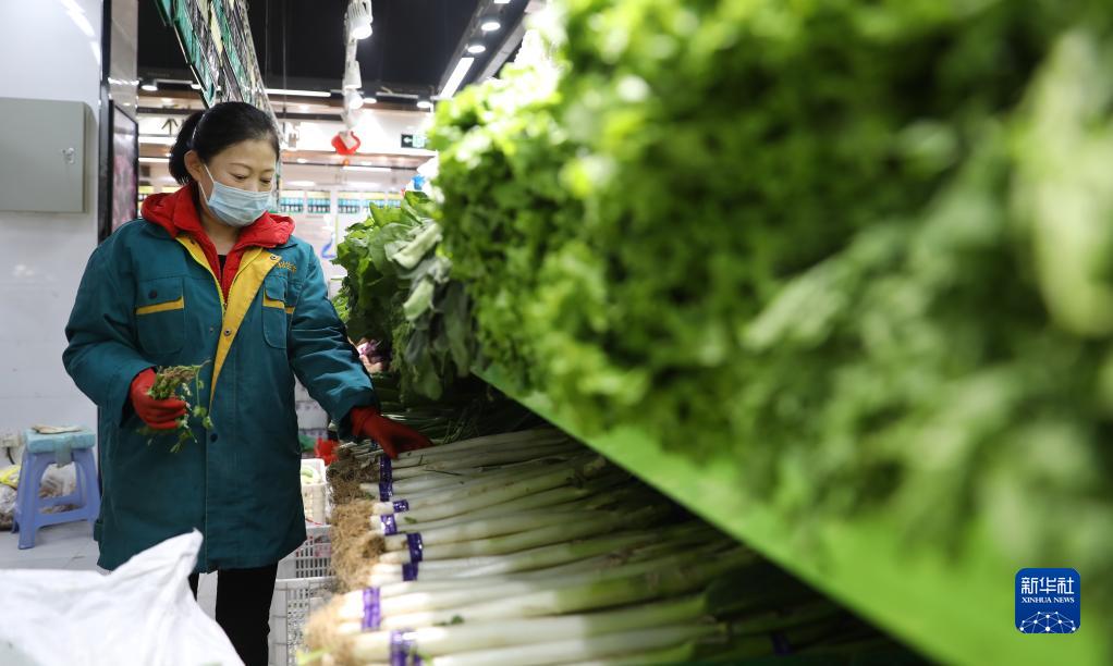 11月18日,一家生鮮超市的售貨人員在整理蔬菜貨架。新華社記者 姚劍鋒 攝