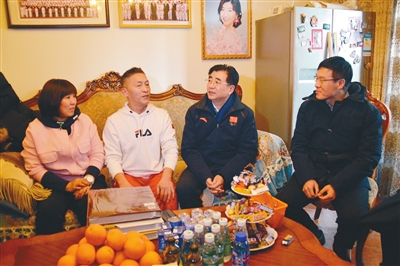遼寧省體育局局長宋凱(右二)一行前往徐夢桃家中慰問。