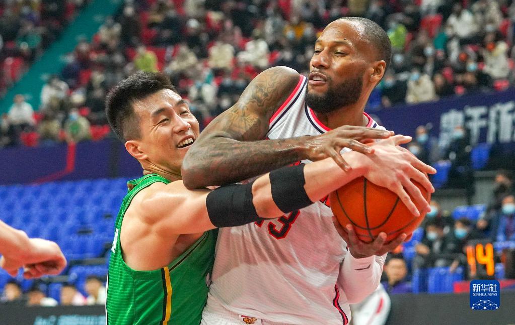 1月13日,廣東東莞大益隊球員威姆斯(右)在比賽中與遼寧本鋼隊球員郭艾倫拼搶。新華社記者 張楠 攝