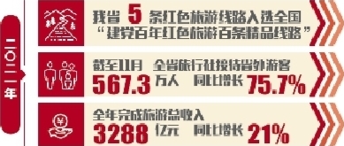 一年來,在我省部分地區經歷散發疫情的情況下,旅游業快起穩進,實現恢復性增長。2021年,完成旅游總收入3288億元,同比增長21%;文化旅游重點項目完成投資140億元,同比增長16.7%,有效推動了旅游強省建設。