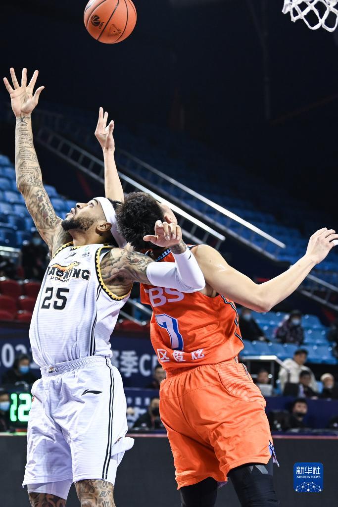 1月15日,福建潯興股份隊球員區俊炫(右)與遼寧本鋼隊球員莫蘭德在比賽中拼搶。當日,在吉林長春進行的2021-2022賽季中國男子籃球職業聯賽(CBA)第二階段第23輪比賽中,福建潯興股份隊以83比109不敵遼寧本鋼隊。新華社記者 顏麟蘊 攝