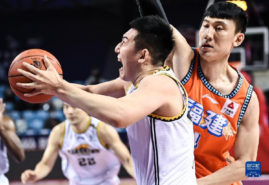1月15日,福建潯興股份隊球員張永鵬(右)在比賽中防守遼寧本鋼隊球員付豪的進攻。當日,在吉林長春進行的2021-2022賽季中國男子籃球職業聯賽(CBA)第二階段第23輪比賽中,福建潯興股份隊以83比109不敵遼寧本鋼隊。新華社記者 顏麟蘊 攝