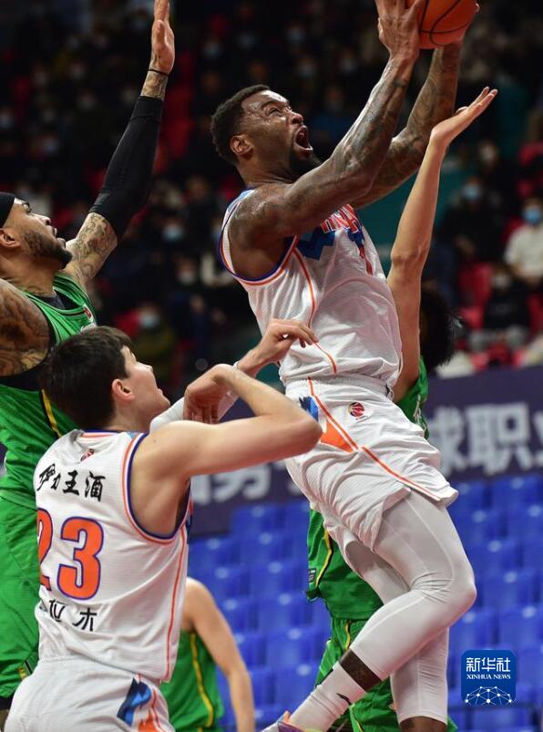 1月20日,新疆伊力王酒隊球員摩爾特里(右)在比賽中上籃。
