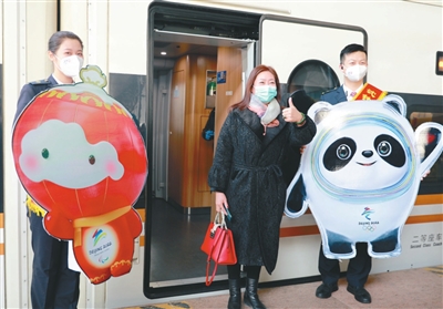 1月25日,在沈陽北站7站臺上,高鐵乘務員手持敦厚可愛的北京冬奧會、冬殘奧會吉祥物冰墩墩、雪容融,引來旅客駐足合影留念。
