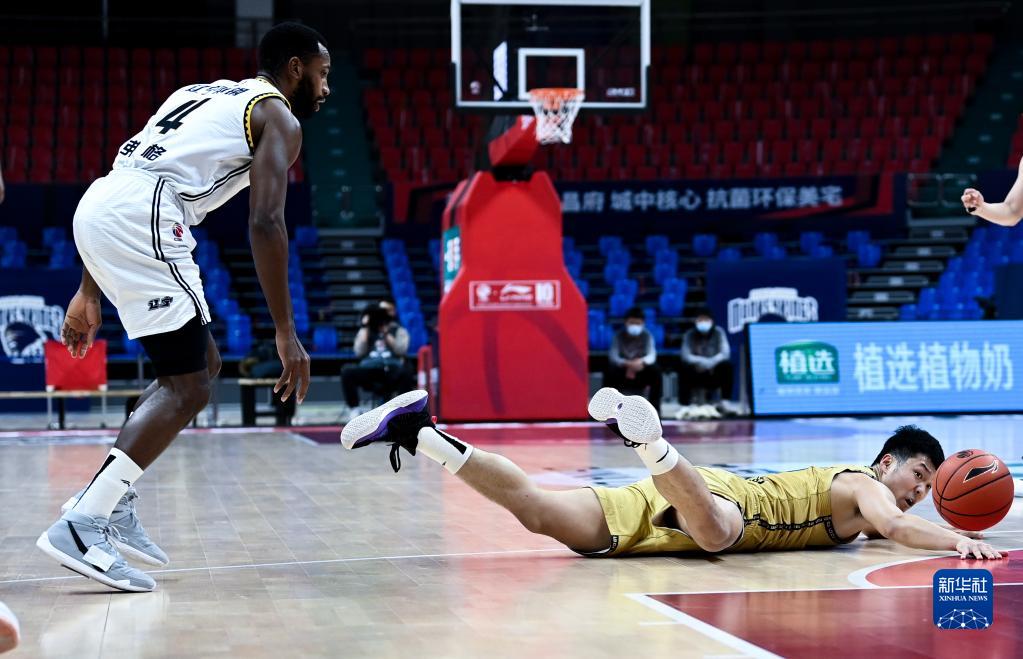 1月27日,南京同曦宙光隊球員李泓澎(右)拼搶時摔倒。新華社記者 顏麟蘊 攝