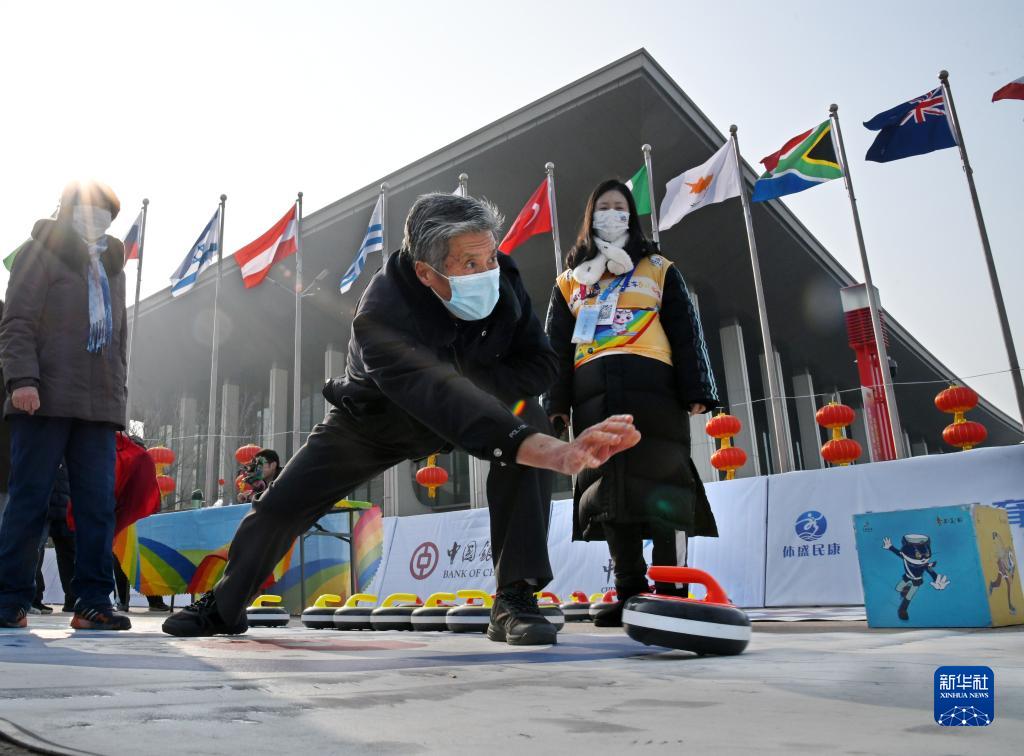 2022年1月8日,在山東青島,一位市民在中國冰雪大篷車百場巡回青島站活動中體驗旱地冰壺。新華社記者 李紫恒 攝