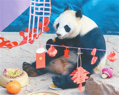 大年初三,沈陽森林動物園的飼養員們為冰華、浦浦、發發、冰清準備了“財源廣進”“綠意盎然”“招財進寶”“如意餃子”“步步高升”“張燈結彩”“虎虎生威”“熊貓外賣”八道大餐,讓大熊貓們也過上喜慶的春節?!白罱鼛滋?,熊貓館內游客比平日明顯增多,四只大熊貓狀態也很好。當天,它們看到飼養員準備的菜肴,非常好奇,馬上跑過去品嘗?!鄙蜿柹謩游飯@工作人員告訴記者,這些菜以饃饃、胡蘿卜、蘋果等為主要原料,制作出精美的造型。其中,“張燈結彩”是做成果盤燈籠形狀的蘋果和胡蘿卜;“虎虎生威”是做成虎頭形狀的南瓜;“招財進寶”和“如意餃子”是做成了元寶和餃子造型的饃饃。這些菜肴既營養又美觀,是飼養員們精心調配制作的。其中,浦浦最喜歡“虎虎生威”這道菜。