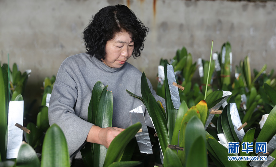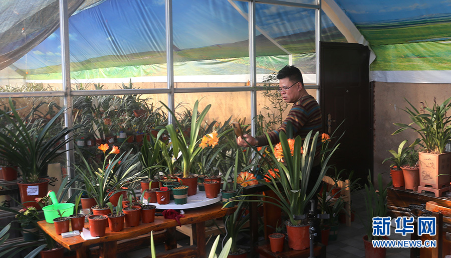 圖為基地內,花農劉靖細心照料自己種植的君子蘭。新華網夏銘陽攝