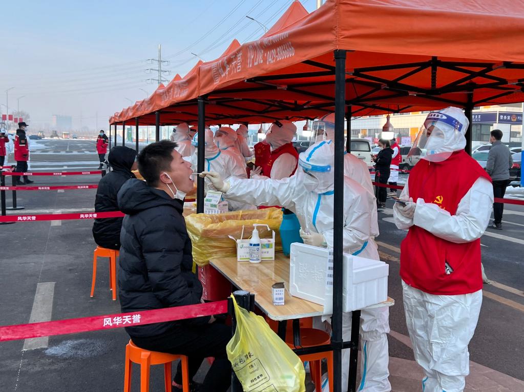 2月12日,綏中縣啟動第三輪區域核酸檢測,爭分奪秒,進一步篩查潛在感染者。記者在綏中縣委附近的一處核酸檢測點看到,8名工作人員分為4組,為居民進行采樣,現場秩序井然。