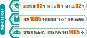 數據顯示,2021年,全省高校新增專業92個,新增博士、碩士學位授予單位各1個,186所職業院校參加“1+X”證書制度試點,實施聯合培養人才等開放辦學項目1465個。