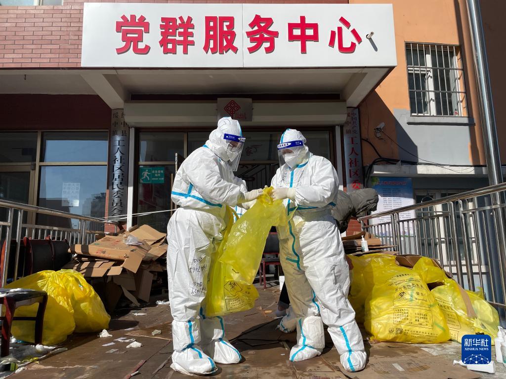 2月15日,在綏中縣的一個封控社區,身著防護服的工作人員在處理醫療垃圾。新華社記者李昂 攝