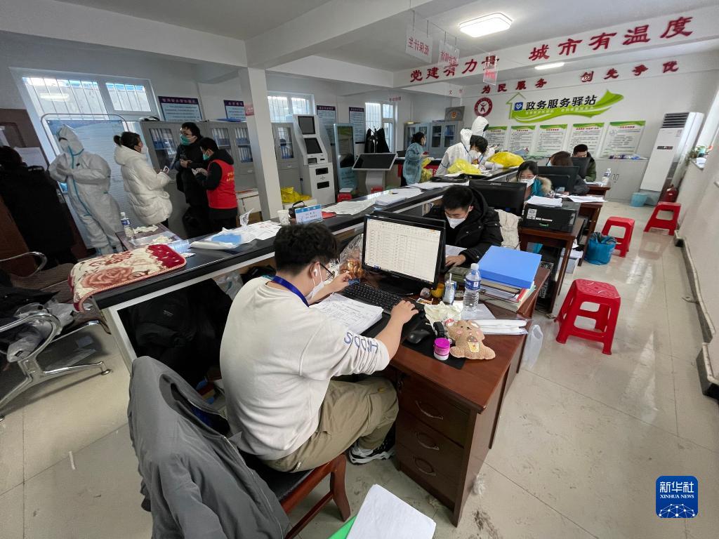 2月15日,在綏中縣的一個封控社區,工作人員正在緊張工作中。新華社記者李昂 攝
