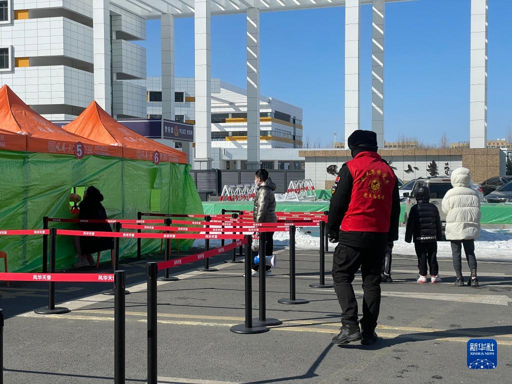 2月15日,在綏中縣的一處核酸采集點,醫護人員和志愿者們在凜冽的寒風中持續工作。新華社記者李昂 攝