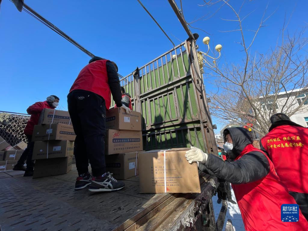 2月15日,在綏中縣的一處物資儲備點,志愿者們在搬運防疫物資。新華社記者李昂 攝