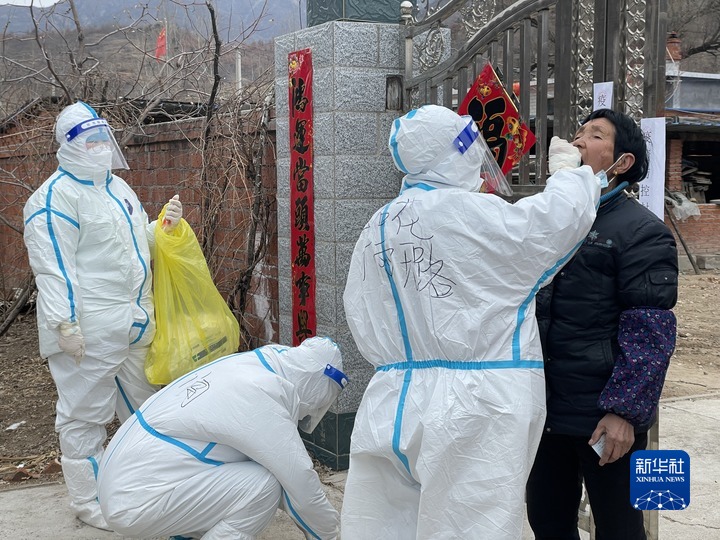 2月12日,醫護人員為封控區內的居民進行核酸檢測采樣。新華社記者 李昂 攝