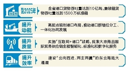 在提升港口發展動能方面,《方案》明確,我省將高起點規劃全省沿海港口布局,推動港口群錯位分工、一體化協同發展,合理預留港口岸線資源,完善碼頭、航道、錨地、內陸干港等基礎設施布局。完善港口基礎設施建設,加快大型化專業化碼頭泊位、航道錨地等公共基礎設施、LNG接收站配套工程建設和老舊碼頭升級改造。完善港口服務網絡,推動碼頭物流向全程物流延伸,發展“門到門”物流服務。