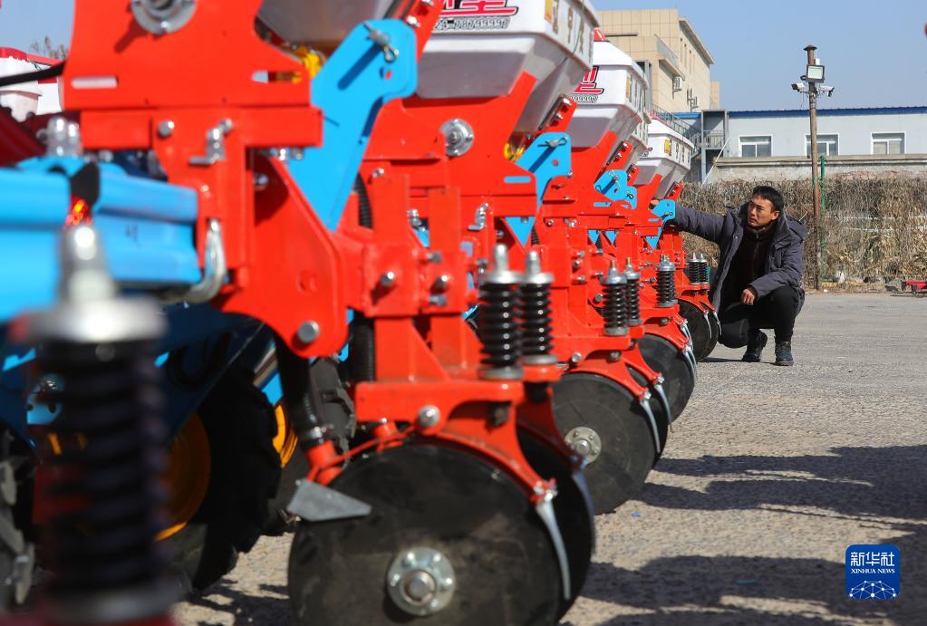 2月23日,在鐵嶺縣遼寧實豐機械有限公司,工人檢查即將出廠的玉米播種機。新華社記者 楊青 攝