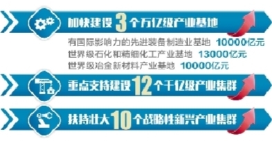 《方案》由重點任務和目標、重點工作、保障措施三部分組成。明確我省將加快建設3個萬億級產業基地,分別是具有國際影響力的先進裝備制造業基地(10000億元)、世界級石化和精細化工產業基地(13000億元)、世界級冶金新材料產業基地(10000億元)。重點支持建設數控機床等12個市場競爭優勢明顯的千億級產業集群。扶持壯大集成電路裝備等10個戰略性新興產業集群。