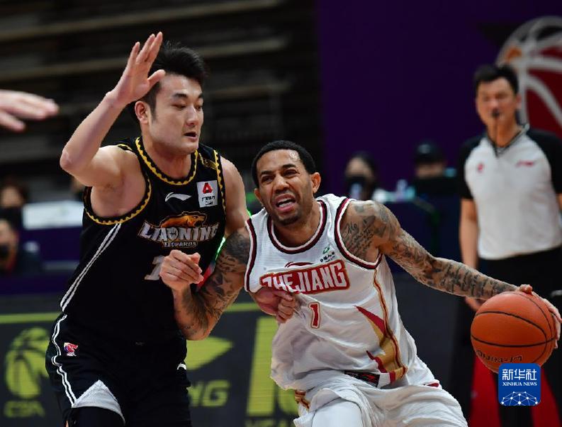3月5日,浙江稠州金租隊球員格林(右)在比賽中突破。當日,在遼寧沈陽進行的2021-2022賽季中國男子籃球職業聯賽(CBA)第三階段第31輪比賽中,浙江稠州金租隊以97比96戰勝遼寧本鋼隊。新華社記者 楊青 攝