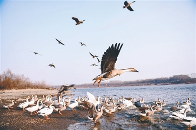 3月7日,在鳥島附近,愛鳥的王大哥笑著對記者說。近年來,沈陽渾河水質生態良好,成為天鵝、大雁、赤麻鴨等候鳥的理想中轉站和棲息地,它們在水中“翩翩起舞”,舞動翅膀,嬉戲游弋,構成一幅生態美景,每年到此越冬的候鳥種類和數量逐年增多。