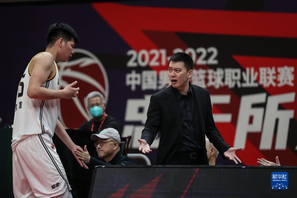 3月11日,遼寧本鋼隊主教練楊鳴(右)在比賽中與球員朱榮振交流。