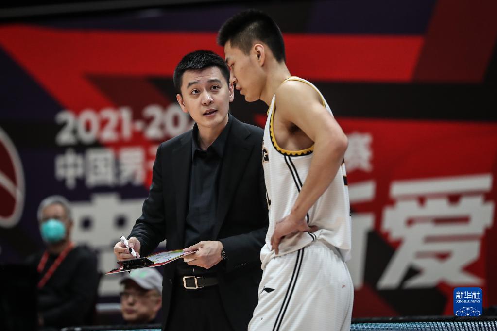 3月13日,遼寧本鋼隊主教練楊鳴(左)在比賽中向球員吳昌澤布置戰術。新華社記者 潘昱龍 攝