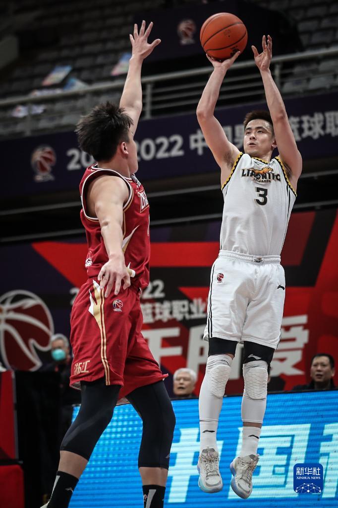 3月13日,遼寧本鋼隊球員趙繼偉(右)在比賽中投籃。新華社記者 潘昱龍 攝