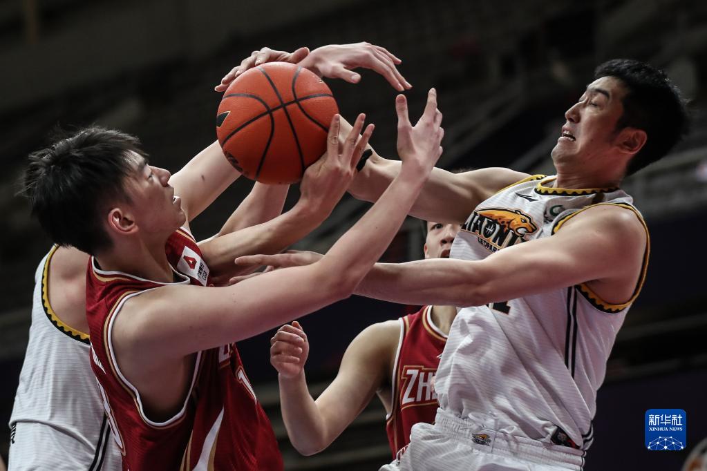 3月13日,遼寧本鋼隊球員劉志軒(右)在比賽中與浙江稠州金租隊球員張洪碩拼搶。新華社記者 潘昱龍 攝