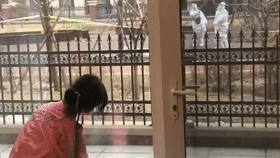 3月12日,在阜新市某疫情管控小區,一位粉紅色上衣的小女孩兒在家中隔窗與“大白”猜拳。窗外的“大白”不時地與小女孩互動,引出孩子陣陣笑聲,場面暖心又有愛。