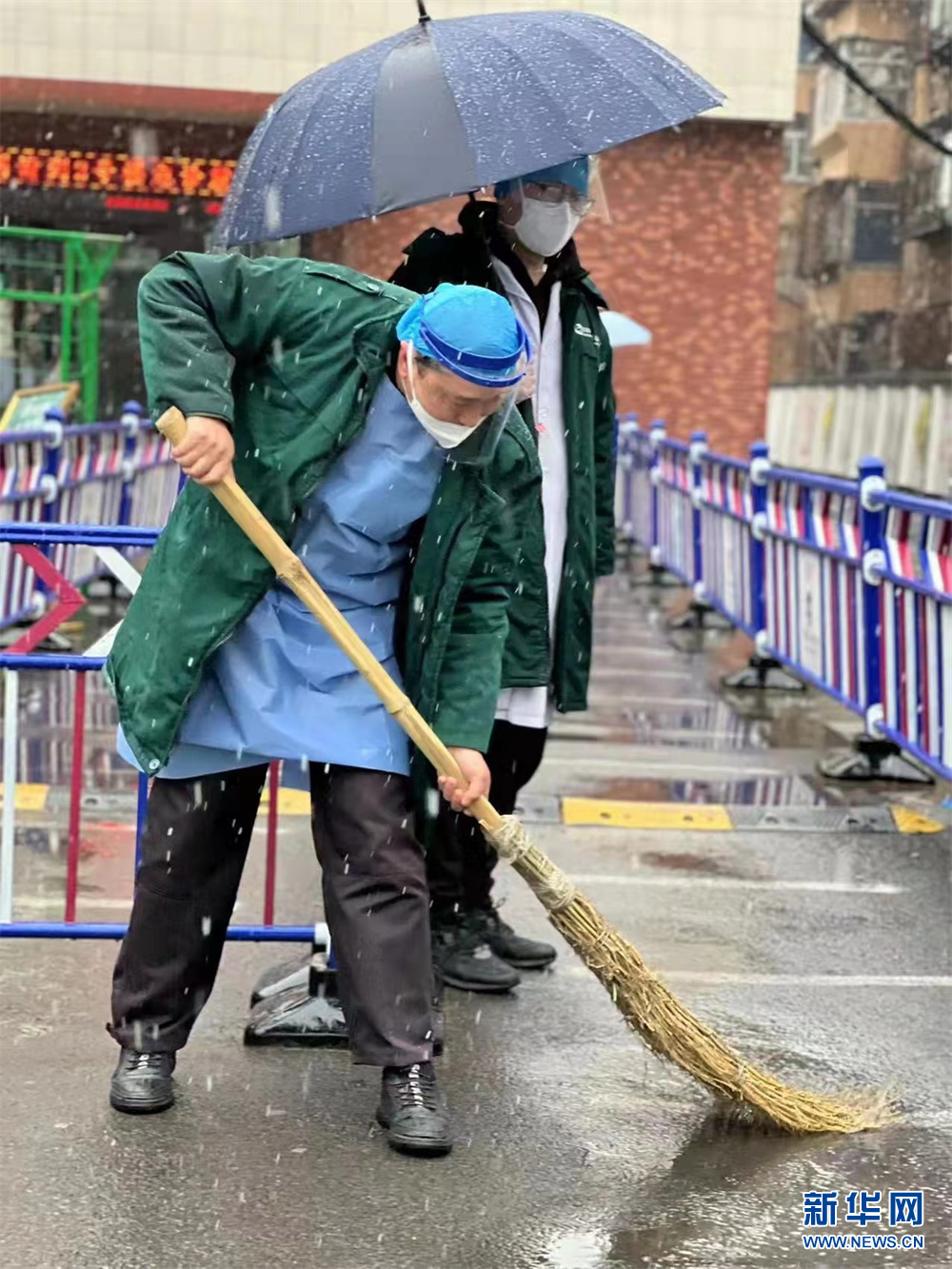 為方便市民出行,沈陽市第六人民醫院工作人員清掃門前積水。(新華網發)