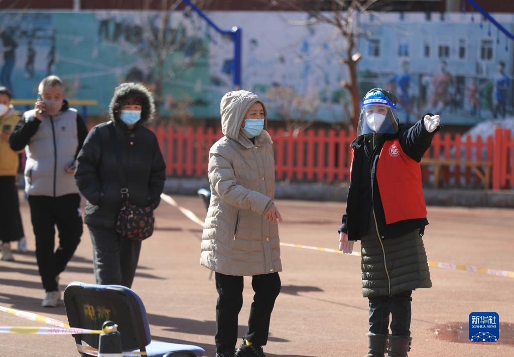 3月17日,在沈陽市和平區河北街第二小學檢測點,抗疫志愿者引導市民有序排隊。新華社記者 楊青攝