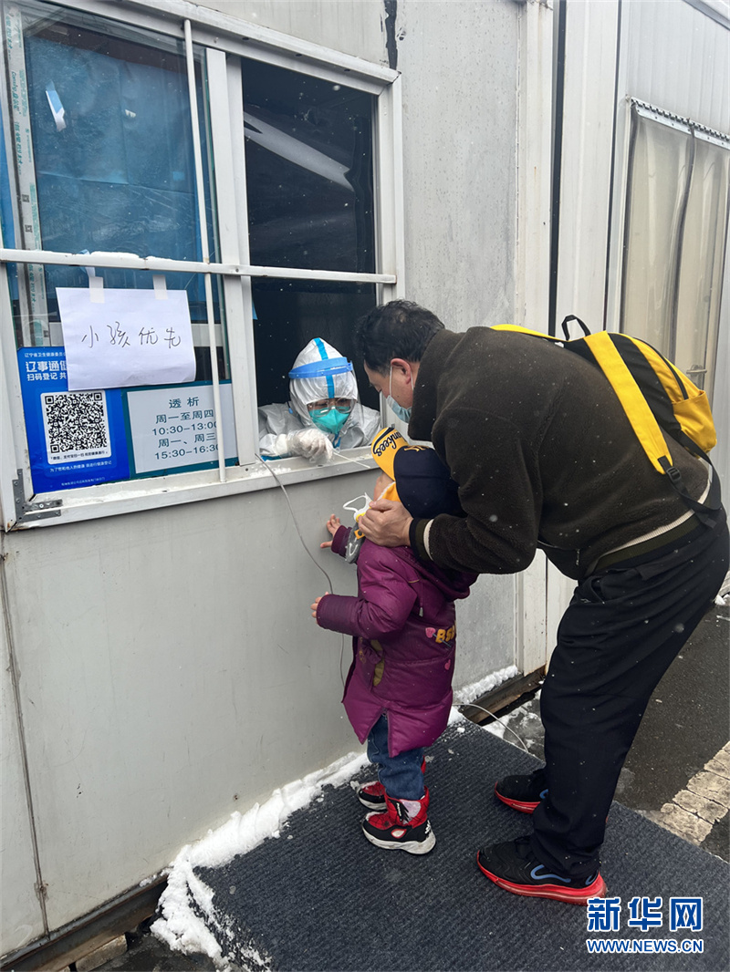 3月18日,鞍山出現降雪,為減少兒童的等待時間,鞍鋼集團公司總醫院核酸檢測隊為小朋友開啟優先檢測窗口。(新華網發)