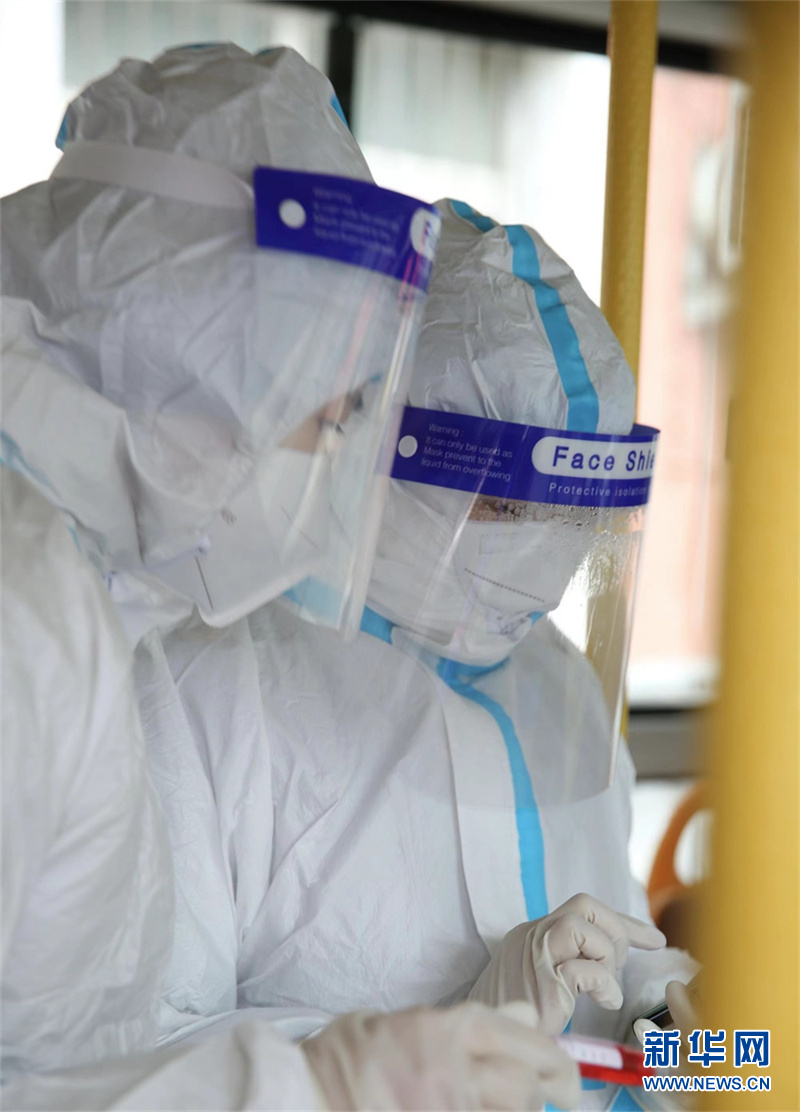 降雪帶來的降溫,讓堅守在采樣一線的“大白”防護面罩結上冰霜。(新華網發 郭春光攝)