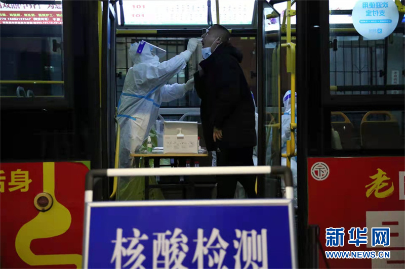 3月18日,鞍山出現降雪。為減少市民排隊等待時間,鞍山啟用公交車作為臨時核酸采集點。(新華網發 郭春光攝)
