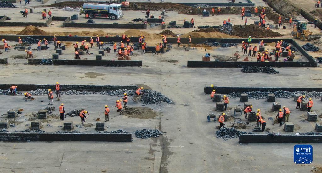 3月22日,沈陽國際展覽中心,各施工單位工人加緊建設健康驛站(無人機照片)。新華社記者 楊青 攝