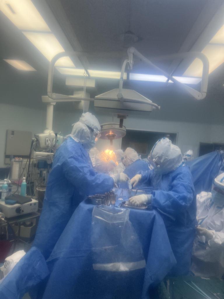 當天下午2時,患者被推進隔離手術間,這是一場生命與時間賽跑的手術。手術間里,沉重的呼吸聲此起彼伏。包括谷天祥、師恩祎在內的十幾名醫護人員穿著密不透風的防護服和一次性手術衣,擠在不能使用中央空調的負壓手術室內,衣服早已濕透,呼出的哈氣也在面屏上結成了霧氣。