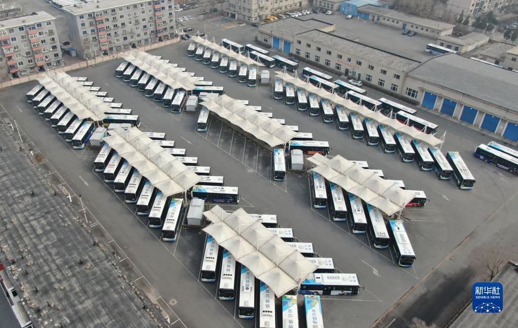 這是3月24日在沈陽一公交車停車場拍攝的公交車(無人機照片)。新華社記者 楊青 攝