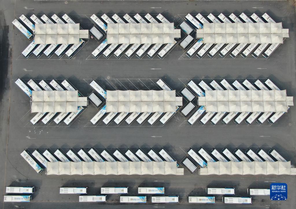 這是3月24日在沈陽一公交車停車場拍攝的公交車(無人機照片)。新華社記者 楊青 攝