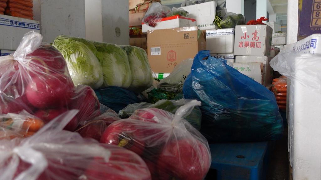 沈陽副食集團廚房速遞庫房內,團購配送的蔬菜等待被送往企事業單位的食堂。新華社記者 張琦汝 攝