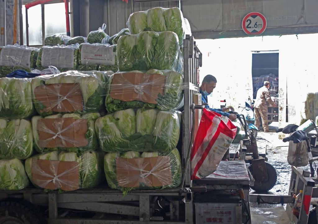 沈陽盛發蔬菜批發市場內,商販正在裝載白菜。新華社記者 張琦汝 攝
