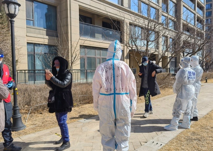 也有居民用手機拍下了李曉霞志愿服務中的小插曲:坐在推車上排隊的李曉霞女兒認出了全副武裝的母親,不停地喊“媽媽”,直到李曉霞輕聲回應,女兒回頭問:“媽媽,你還回不回去?”