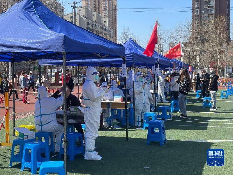 3月26日,沈陽市彩霞社區核酸檢測點核酸采樣工作有序進行(手機照片)。