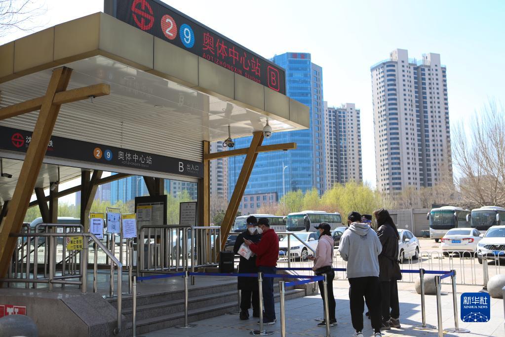 4月13日,在沈陽市奧體中心地鐵站,地鐵工作人員查驗乘車市民的核酸檢測陰性證明。新華社記者 王乙杰 攝