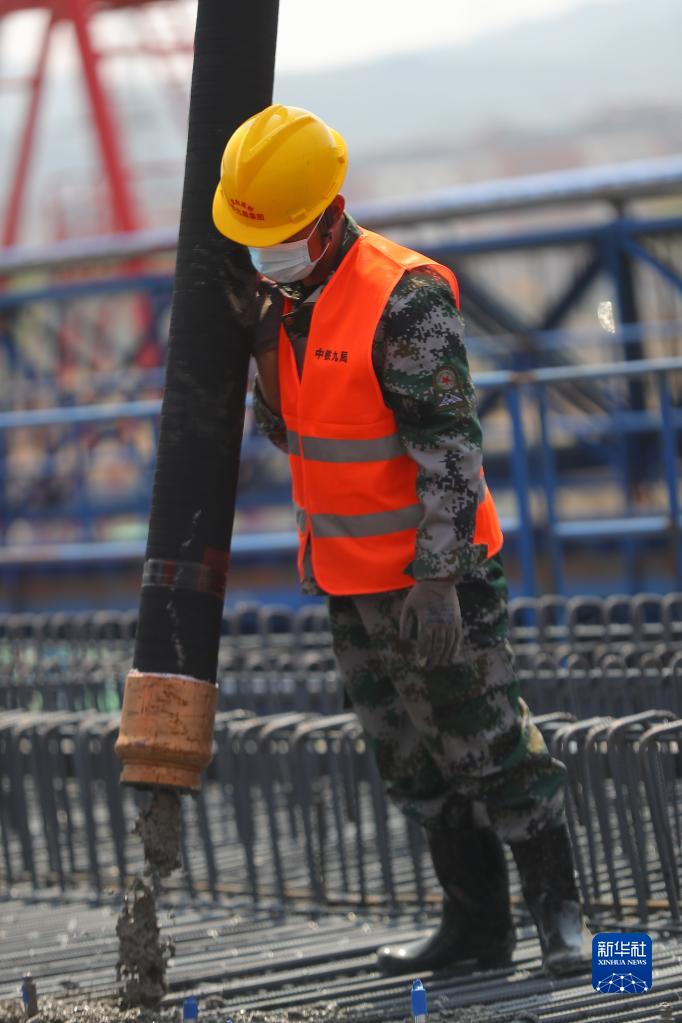 4月20日,在中鐵九局沈白高鐵蘭山制梁場內,中鐵九局工程技術人員在澆筑箱梁。新華社記者 楊青 攝
